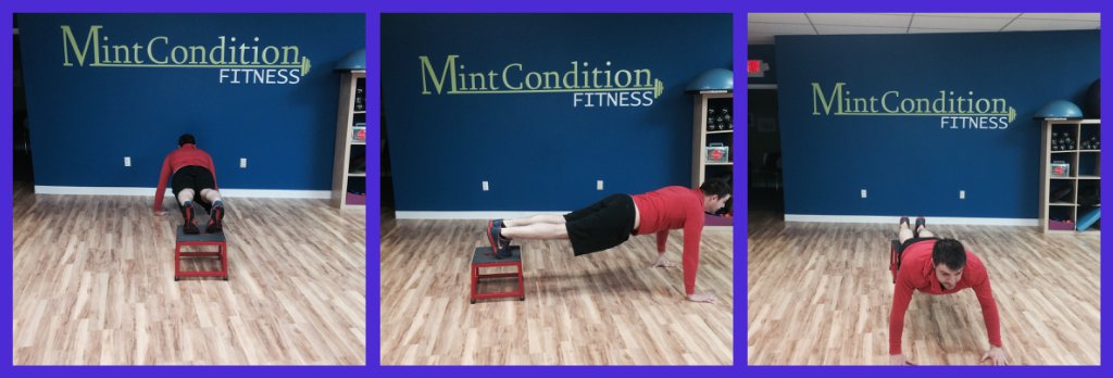 Place a 12 inch plyo-box or similar to in the middle of the floor. With your feet placed on top of the box perform a straight arm plank. Keep your core strong and begin to walk your hands meeting the right to the left. This will move your body clockwise around the box in a circle. One round is finished when you come back to the beginning.