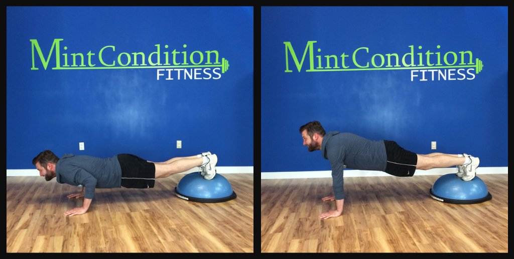 1. Start in the plank position with your feet centered on top of the bosu ball. Be sure to keep the core contracted and your shoulders in-line with your wrists.